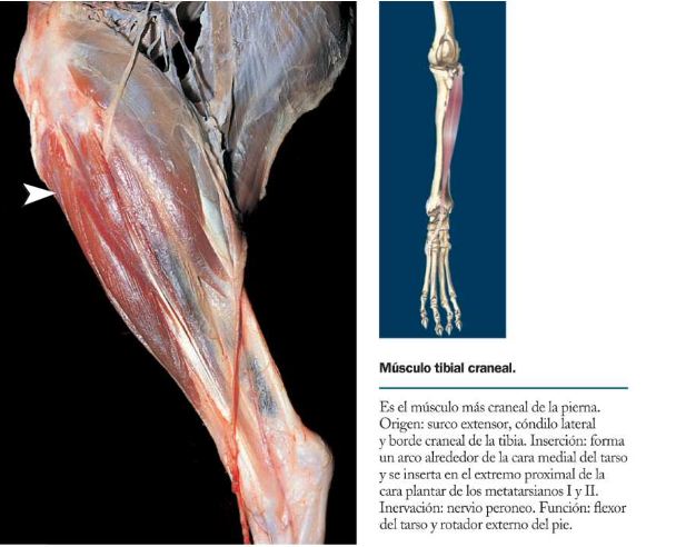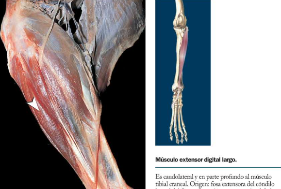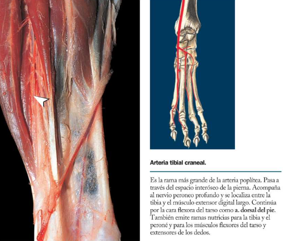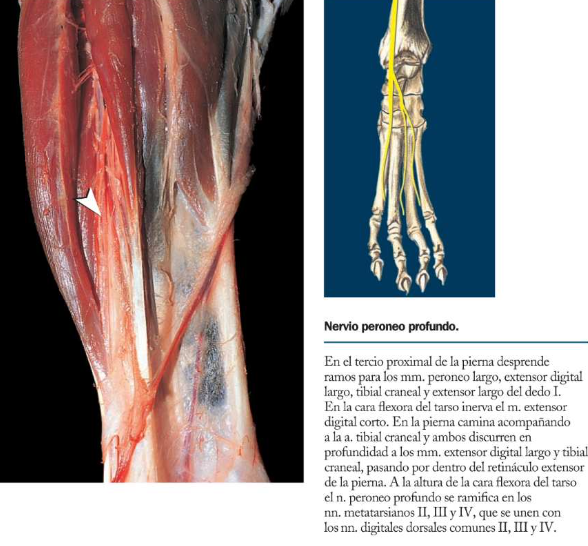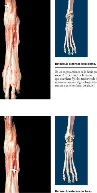 Medialmente esta el tendon del tibial craneal que pasa por el retinaculo proximal pero no distal y va a la extermidad proximal del segundo metatarsiano. entre estos dos tendones esta el paquete vasculo nervioso de la arteria tibial craneal y del nervio peroneo profundo