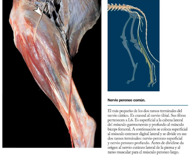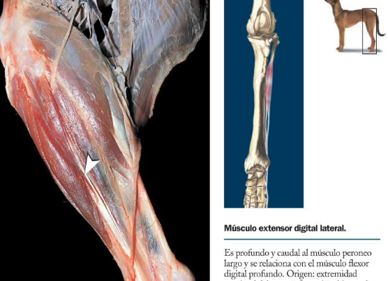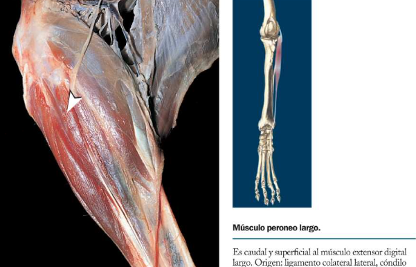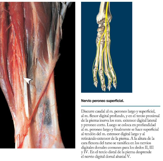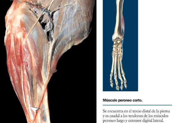 El mas craneal es el del extensor digital lateral que termina en el tendon digital comun, del peroneo corto y el del peroneo largo hacia caras plantares