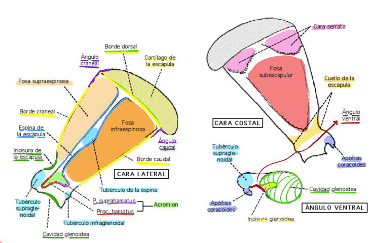 Acromion: Proceso suprahamatus (caudalmente) y proceso hamatus (ventralmente)