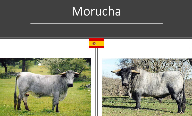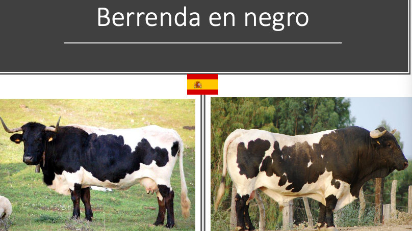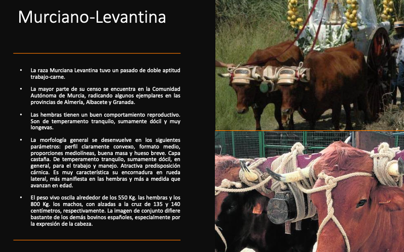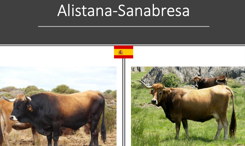 Albera, Alistana-sanabresa, Asturiana de la Montaña, Asturiana de los Valles, Avileña-Negra Iberica (Incluida la varidad bociblanca), berrenda en colorado, berrenda en negro, betizu, blanca cacereña, bruna dels pirineus, cachena, caldelá, canaria, cardena andaluza, frieiresa, lidia, limiá, mallorquina, marismeña, menorquina, monchina, morucha (incluida la variedad negra), murciana-levantina, negra andaluza, pajuna, pallaresa, palmera, parda de montaña, pasiega, pirenaica, retinta, rubia gallega, sayaguesa, serrana de teruel, serrana negra, terreña, tudanca, vianesa