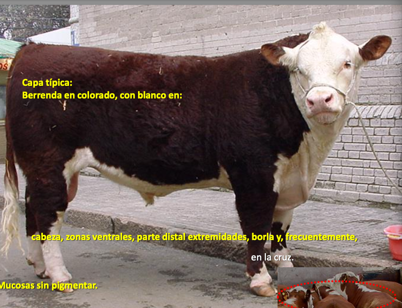 Hereford: Cara blanca (orejas marrones)punta cola blanca, mucosa rosada