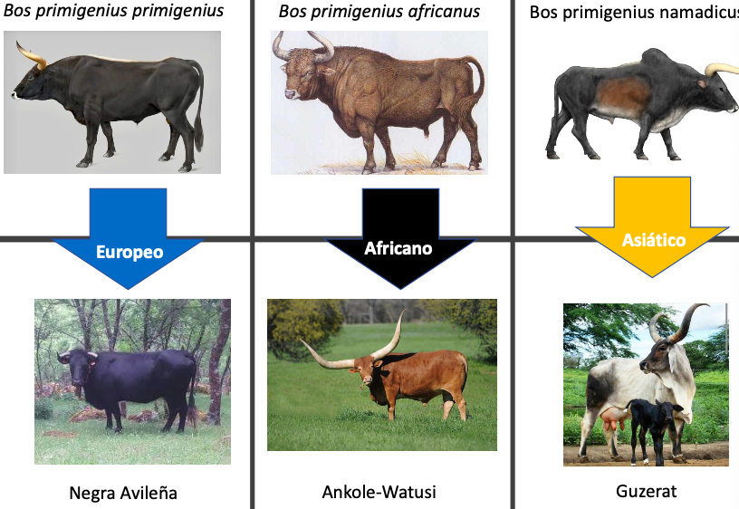 Uro del medio oriente (haplotipo mitocondrial "T", haplotipo sexual masculino "Y2"): dio origen al ganado doméstico europeo actual (Bos primigenius taurus).• Bos primigenius africanus = Bos primigenius opisthonomous: dio origen a las razas africanas.