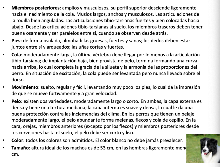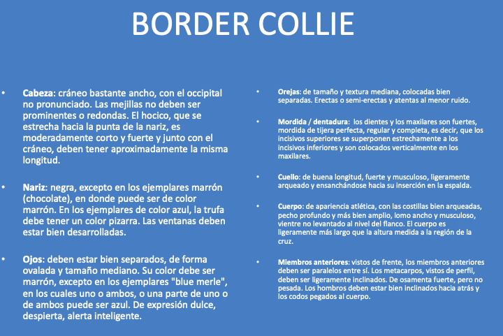 Se incluyen aspectos tales como la textura del pelo, los colores admitidos del mismo, el tamaño (tanto para machos como para hembras), el tipo de movimiento que deben tener y la funcionalidad a la que responde esa raza en concreto