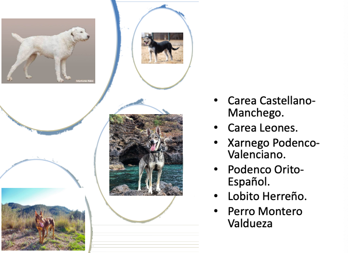Majorero, Perro de pastor Vasco, Perro de pastor garafiano, Perro leones de pastor, Valdueza, Alano Español, Ratonero Bodeguero Andaluz, Podenco Andaluz, Maneto, Podenco Valenciano y Pachon Navarro