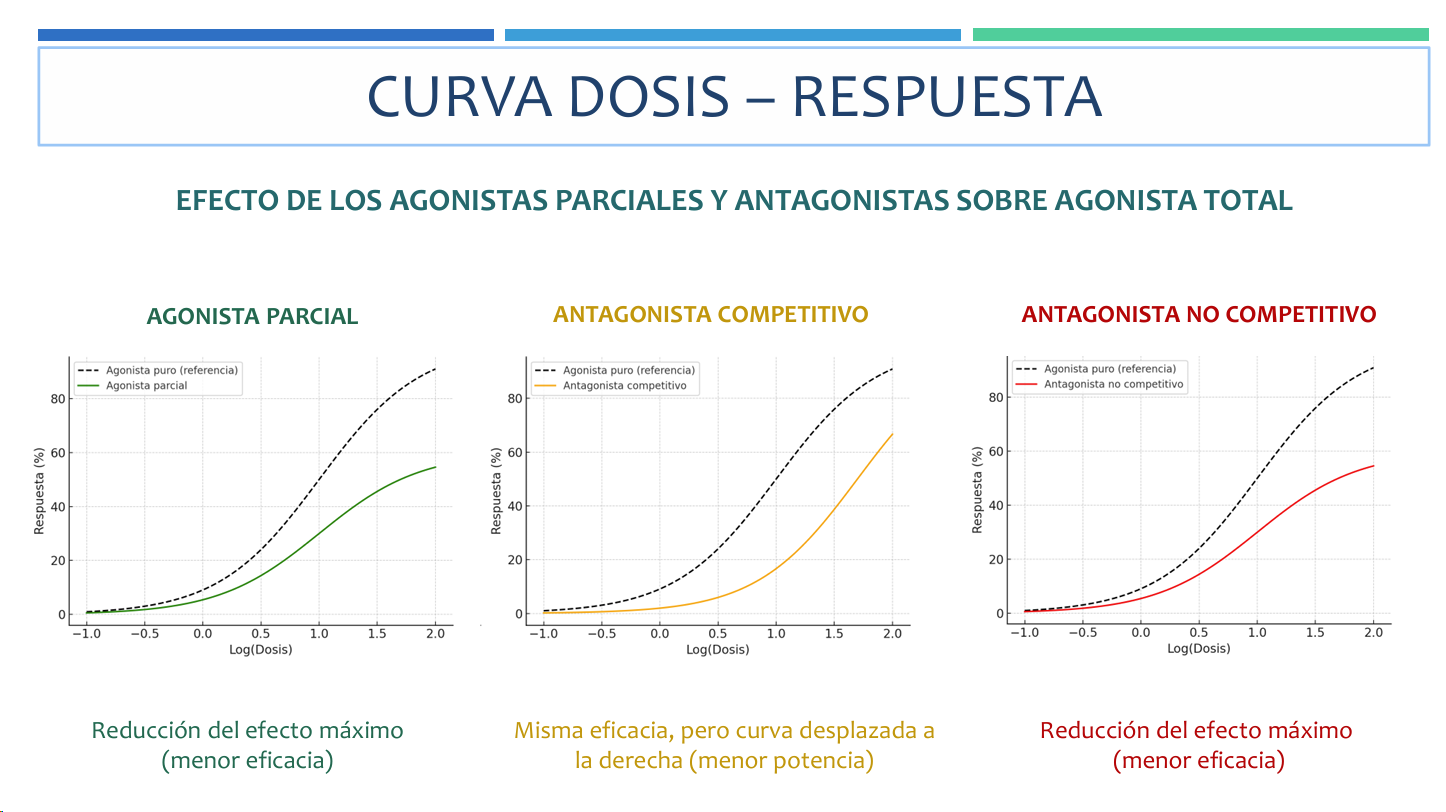 - Agonista parcial: se une al receptor, lo activa parcialmente, y nunca logra un efecto máximo, aunque todos los receptores estén ocupados. Ej.: buprenorfina.