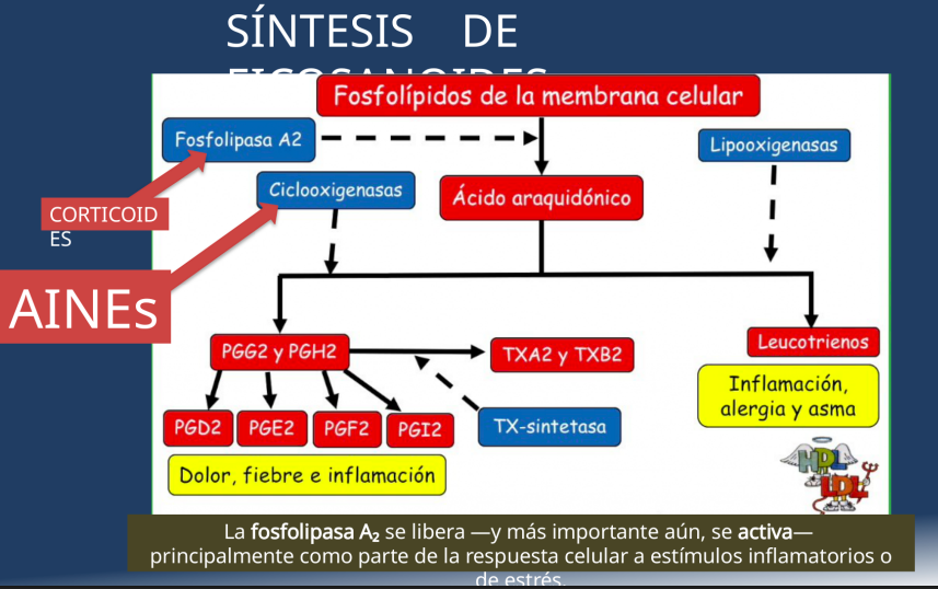 Las corticoides inhiben la fosfolipasa A2 y por tanto la sintesis de acido araquinodico que se encargan como los Aines del dolor, fiebre e inflamación por impeir la sintesis de PGG2 y PGH2 pero tambien los de leucotrienos que se encargan de la inflamación, asma y alergia.