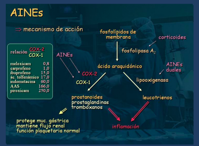 Un aines en una molecula capaz de inhibir la ciclooxigenasas y por tanto la sintesis de PGG2 y PGH2 que se encargan del dolor, fiebre e inflamación.