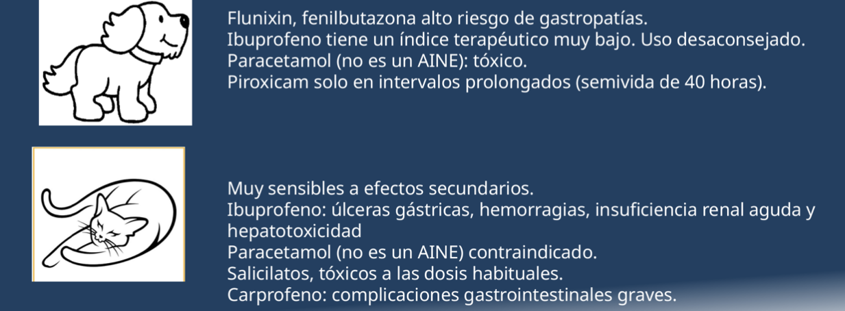 - Paracetamol: No es AINE, pero es tóxico para perros y gatos, sobre todo gatos
