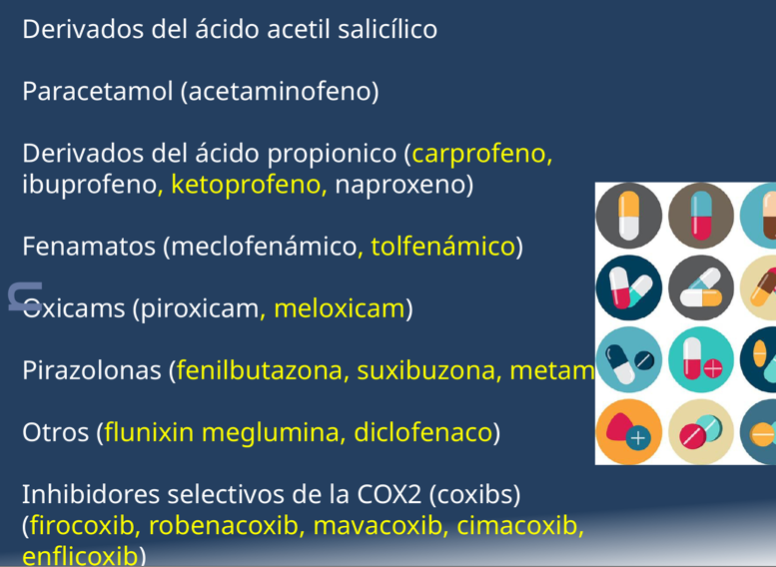 - AINE: Aspirina., ketoprofeno, flunixin meglumine, dipirona.