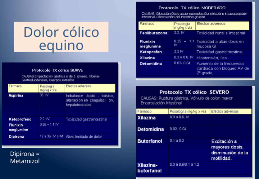 - Analgésicos: Dipirona, Butorfanol.