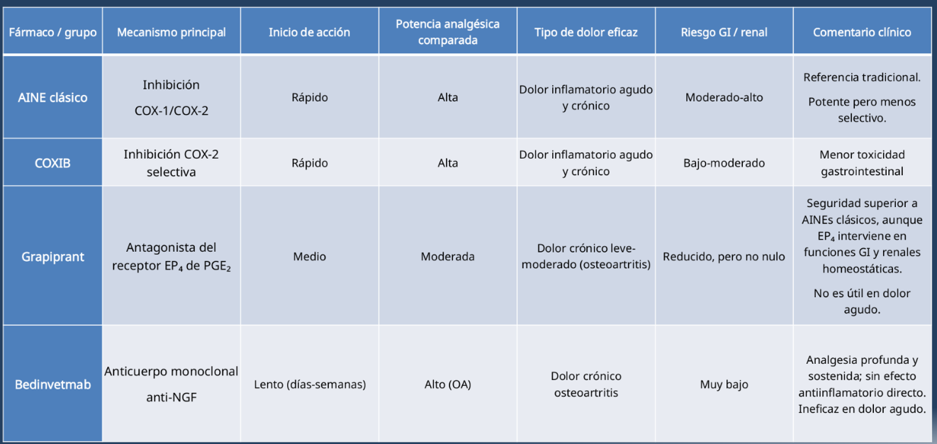 | AINE clásico | Inhibición COX-1/COX-2 | Inflamatorio agudo | Alta | Alta |