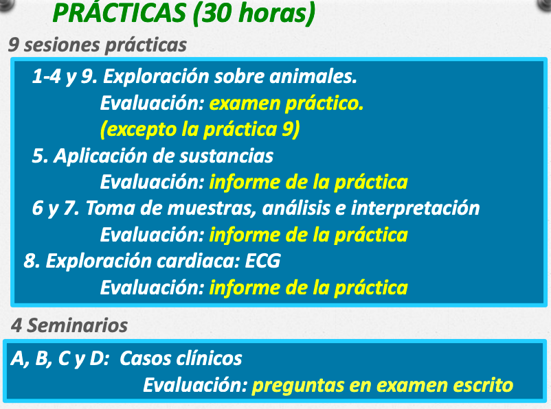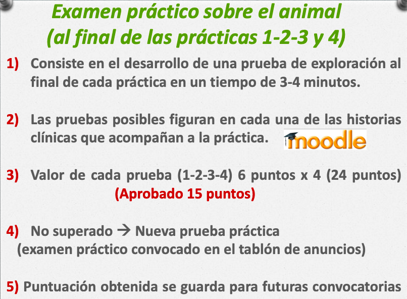 - 6 horas de seminarios (1 pregunta por seminario en el examen) - Anamnesis, Hematologia, evaluación de la condicion corporal en gatos y perros, manejo y exploración en porcino.