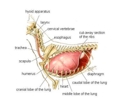 (Imagen: esquema anatómico del aparato hioideo, corte de costillas y lóbulos pulmonares; fuente: Washington State University College of Veterinary Medicine).