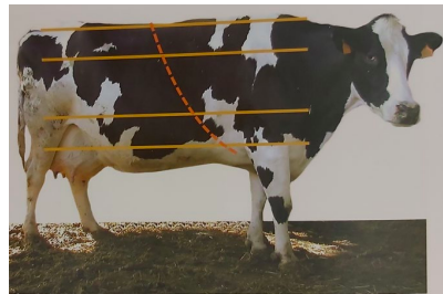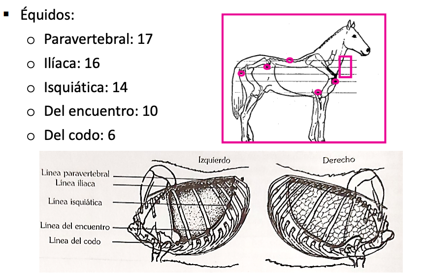 (Imagen: líneas anatómicas del tórax en equino y bovino, fuente: Pastor, 2006).