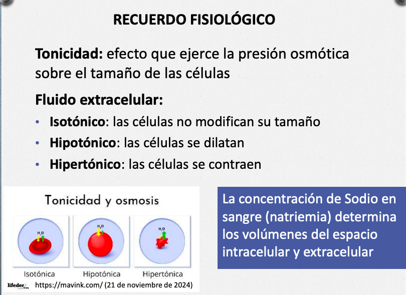 La concentración de Sodio en sangre (natremia) determina los volúmenes del espacio intracelular y extracelular.