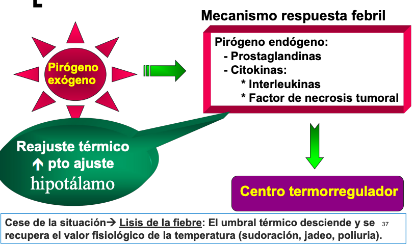 La lisis de la fiebre es cuando el umbral termico desciende y se recupera el valor fisiologico del organismo (sudoracion, poliuria, jadeo)