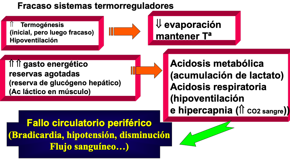 En golpes de calor los mecanismos de perdida de calor son sobrepasados por la cantidad de calor que se recibe (sol, temp, humedad) y que se genera (estres, deporte) y se eleva la temperatura central corporal rompiendose la homeostasis. Produciendose: Deshidratación, Alteración electrolíticas, Hipotensión - Hipoperfusión tisular y por ultimo Lesiones en tejidos y alt funcionales: