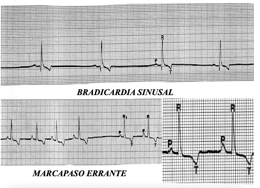 Marcapasos errante Wandering peacemaker: Cambia la morfologia de la P pero sigue siendo sinusal, el nodulo sinular cambia de posicion al ser difuso, pero todos vienen del nodulo sinusal, solo cambia ligeramente la dirección de la onda P, NO SE TRATA