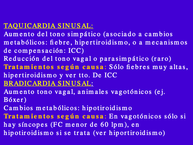 Bradicardia sinusal Aumento del tono vagal, animales vagotonicos (Braquicefalos, boxer), Cambios metabolicos (hipotiroidismo) Tratamientos: En vagotonicos solo hay sincopes (FC menor de 60) e hipertiroidismo si que se puede tratar
