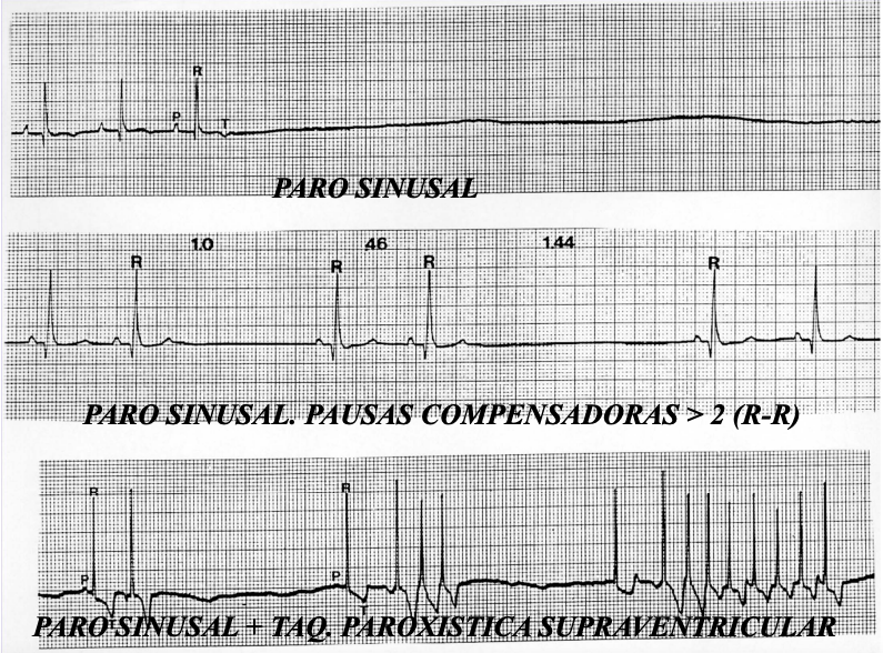 - Paro sinusal + taquicardia paroxística supraventricular.