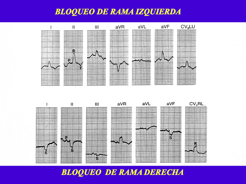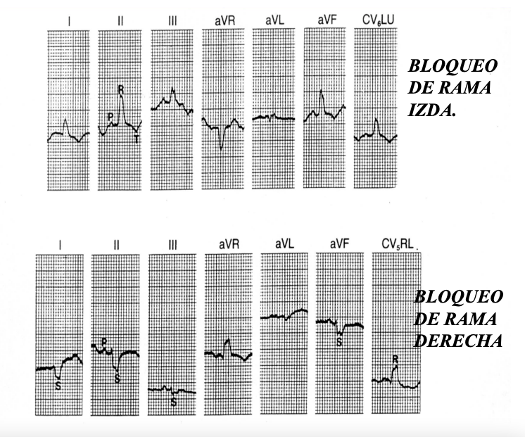 Problema en las paredes del ventriculo, el estimulo no se transmiten correctamente. En ambas el QRS está alterado. Si es lo del lado izquierdo se ve una doble R, en problema en rama derecha, vemos una r minuscula y S s' muy grandes y un QRS mas amplio. Esto a veces indica una cardiomegalia de un ventriculo