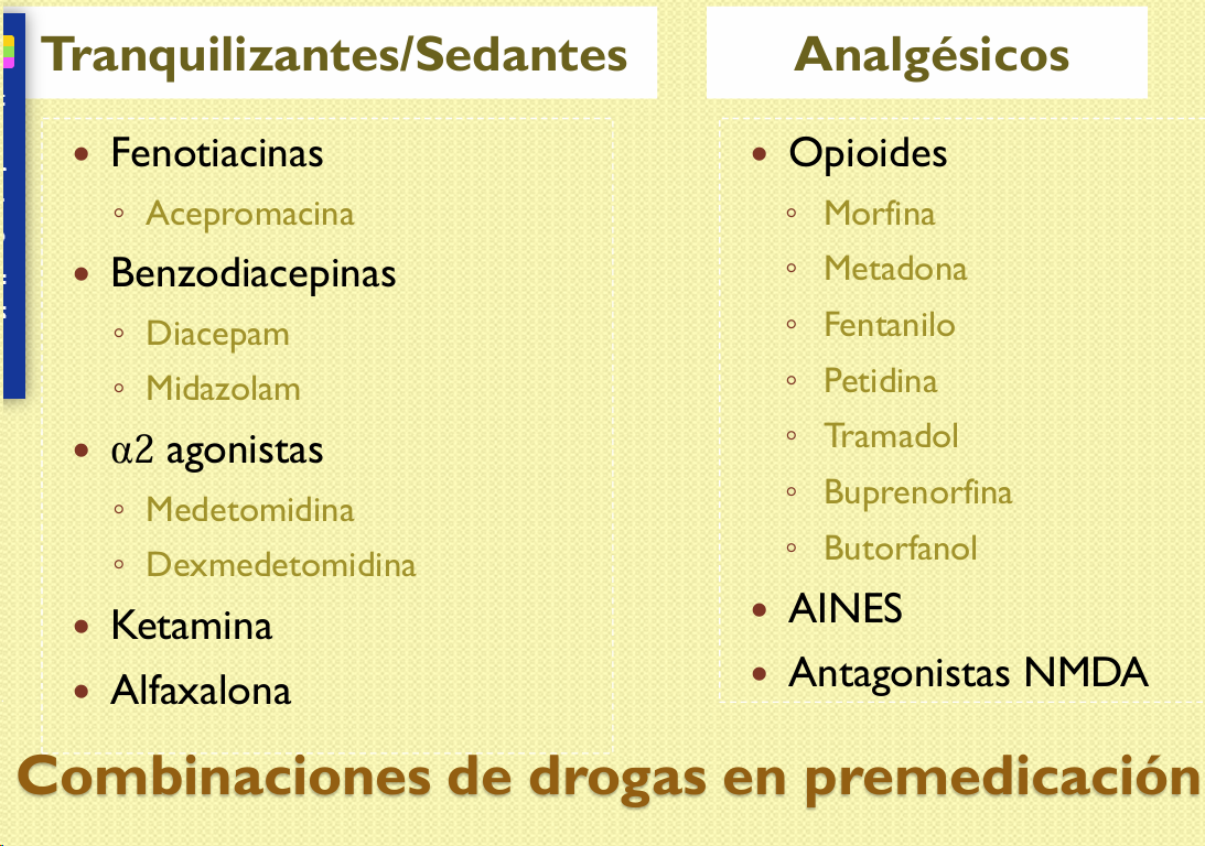 Premedicación Administración de diferentes fármacos sedantes, analgésicos y relajantes musculares al inicio del procedimiento anestésico. Puede ser tanto intravenosa como intramuscular. (Oral y subcutanea no se usan)