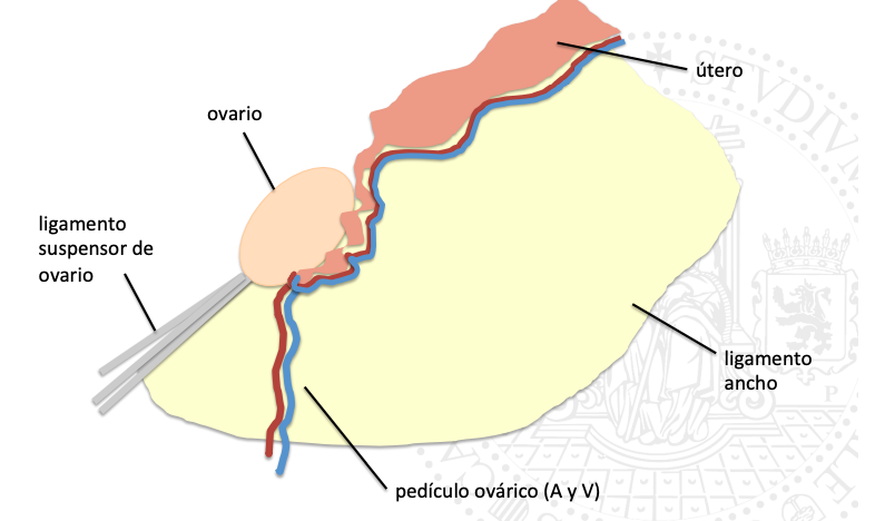 ovario / útero / ligamento ancho / pedículo ovárico (A y V) / ligamento suspensor de ovario)