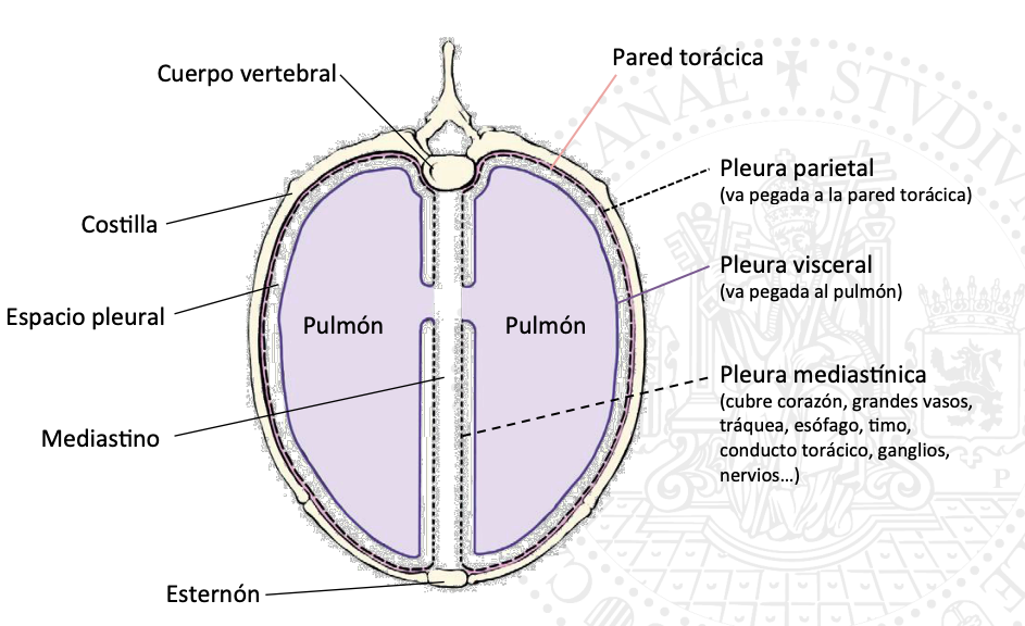- Pleura mediastínica (cubre corazón, grandes vasos, tráquea, esófago, timo, conducto torácico, ganglios, nervios…)