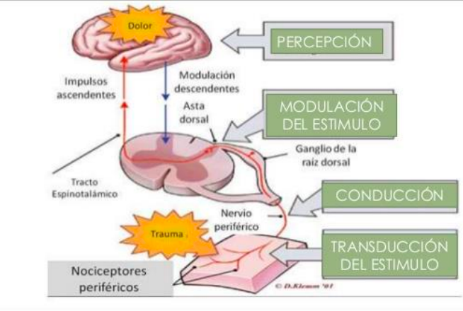 Nociception: recepcion, conducción y procesamiento central de las señales nerviosas generadas por la estimulacion de nociceptores. Es el proceso fisiologico que una vez completado permite la percepción consciente del dolor