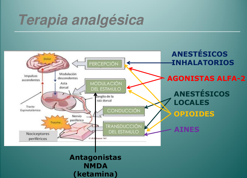 Ausencia de la percepcon de dolor. Hay multimodal y preventiva Generalmente un opioido puro (morfina)