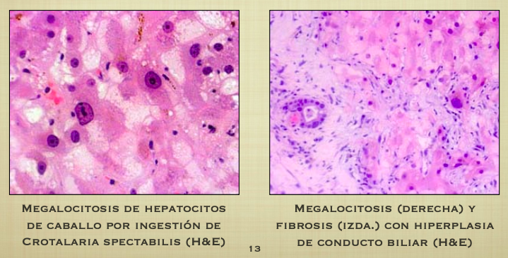 - [Imagen: Megalocitosis de hepatocitos de caballo por ingestión de Crotalaria spectabilis (H&E)]