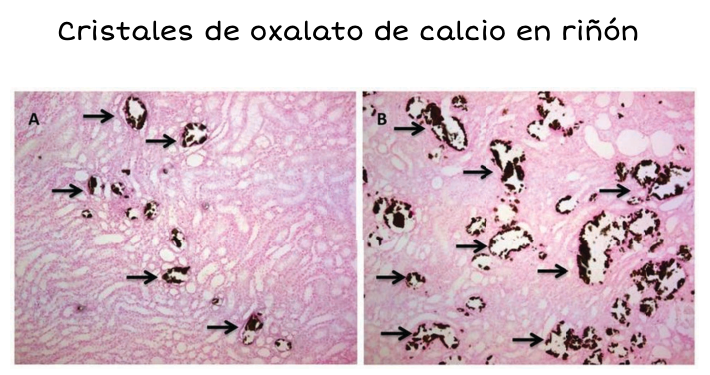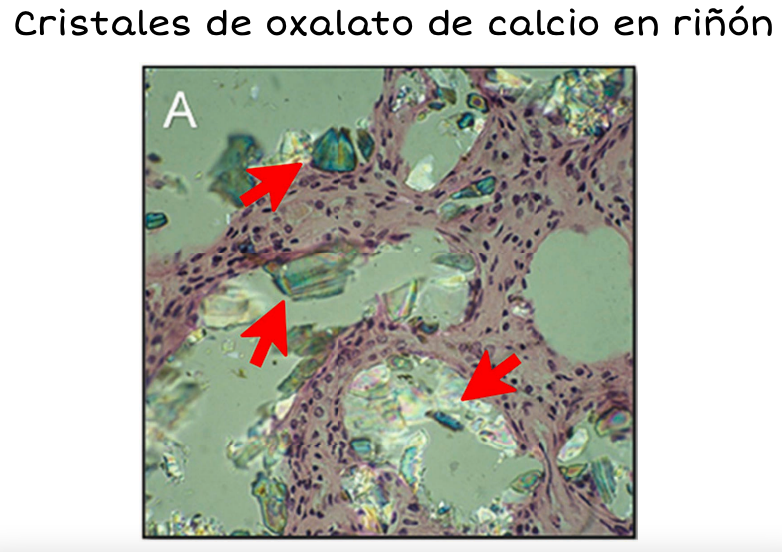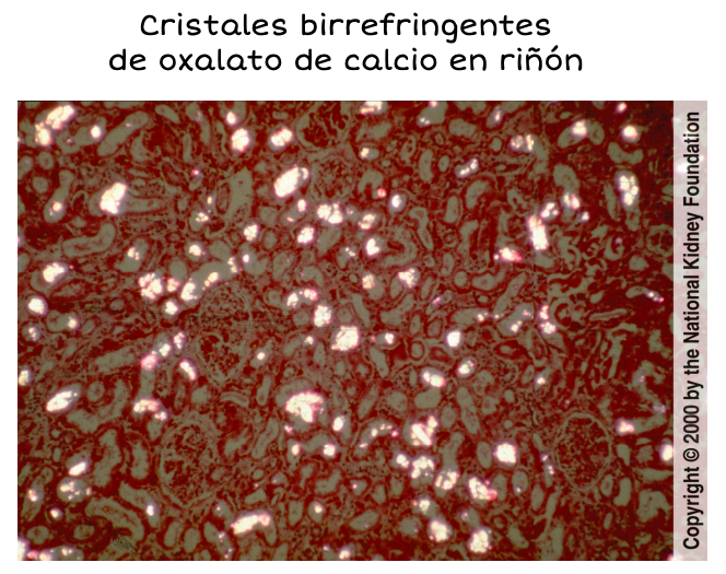 - Cristales birrefringentes de oxalato de calcio en riñón.