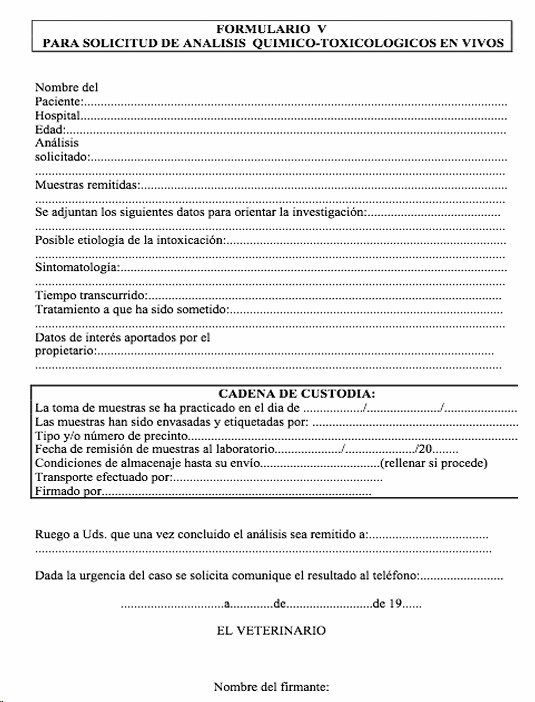 Sangre completa (Sin coagular), orina, biopsia hepática, leche, pelo, fluido ocular, ingesta y cebos, alimento, plantas, suelo, agua. Congeladas: suero sanguineo, heces, visceras, vómitos y aspirado. La extración de sustancias orgánicas no volatiles es especial