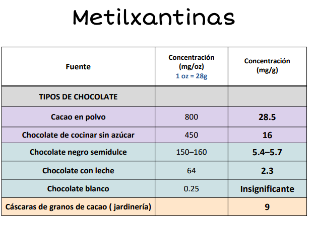 DL50 cafeína/teobromina: 100–200 mg/kg