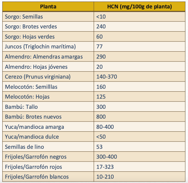 - Bambú: hasta 8000 ppm de cianuro, sin efecto en pandas, gorilas o lémures.