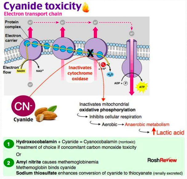 Tratamiento antidótico: impedir que el CN- se una a la citocromo c oxidasa y liberar el ya unido. Conviene utilizarlo cuando la concentración plasmática de CN- es de 3-40 µg/ml. ES UN TRATAMIENTO PELIGROSO, IMPORTANTE.